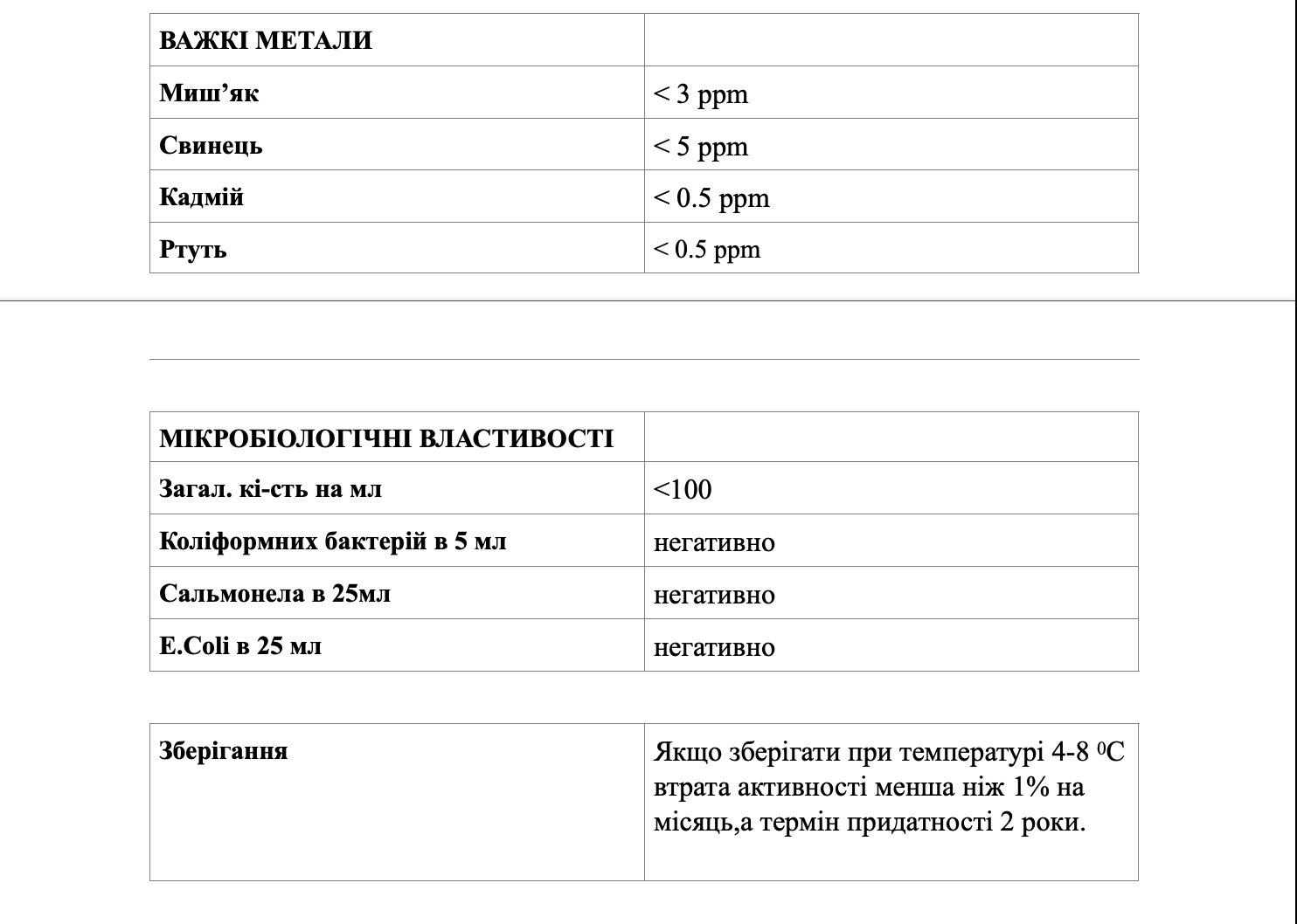 Відсутність патогенів: Протестовано на відсутність сальмонели, коліформних бактерій та кишкової палички.