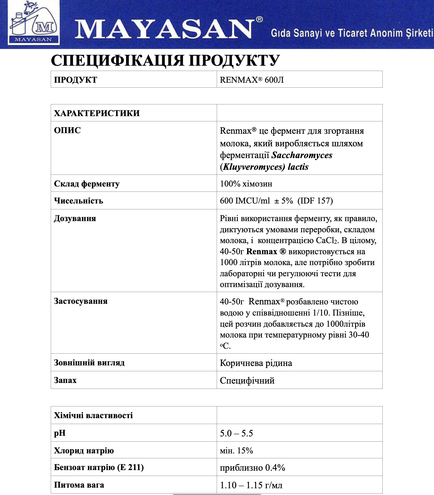 RENMAX® 600 L — це високотехнологічний фермент, отриманий шляхом ферментації мікроорганізмів Saccharomyces (Kluyveromyces) lactis. Його ключовою особливістю є склад — це 100% хімозин, що забезпечує стабільну та передбачувану якість сирного згустку.